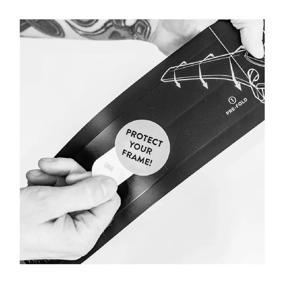 Protección del marco: cada Fendor Bendor se entrega con un pequeño juego de adhesivos de protección transparentes de poliuretano 3M. Úselos para proteger los soportes de su asiento de los arañazos del guardabarros.
