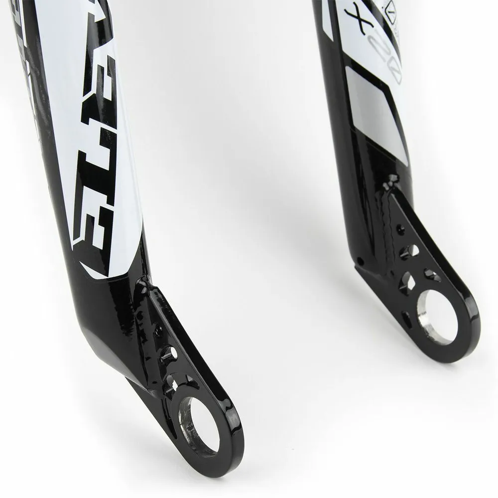 Probada y aprobada por los corredores del equipo CHASE, la horquilla ELEVN OS20 Tapered 20mm es una de las más ligeras y resistentes del mercado de BMX Race. Aún sin límite de peso, mantiene características como el tratamiento térmico, las punteras mecanizadas por CNC, los tubos de doble conificado y el tubo de dirección de triple conificado. Ahora se ofrece en una versión Tapered para su uso en cuadros con tubo de dirección cónico de 1-1/8´´ de alto y 1,5´´ de bajo para los ciclistas que montan cuadros de tamaño OS20 con eje delantero de 20 mm.